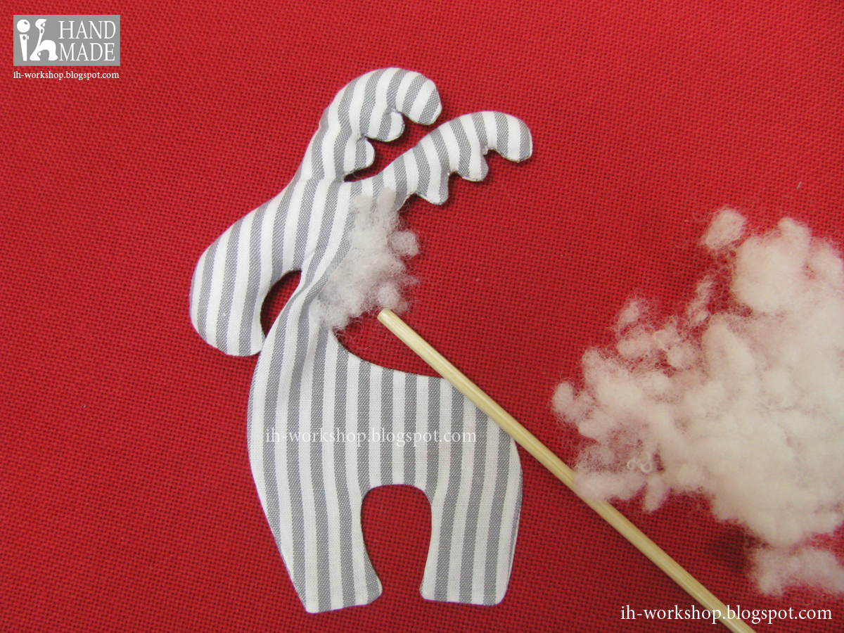 Набивка должна быть плотной, нам ведь не нужны морщинки?! Помните, покатайте игрушку в руках … пусть наполнитель примет нужную форму. Обратите внимание на набивку шеи. Она должна быть набита особо плотно, чтобы наш Олешка гордо держал голову! )))