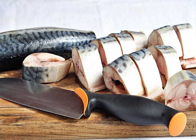 Скумбрию я бы посоветовала не размораживать окончательно, пусть она останется твердой, чтобы кусочки при нарезке получались ровными.