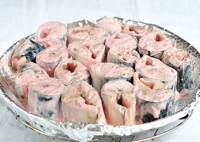 Только и осталось, что посолить рыбу и обмазать ее соусом (для соуса нужно просто смешать горчицу и майонез).