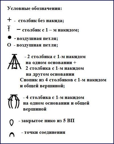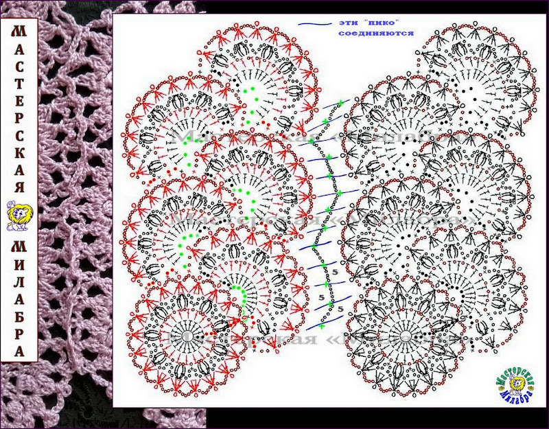 Ленточное кружево создано на базе круглого мотива узора № 73 ![]() Видео вязание Мастерская Милабра Схема ленты Схема узора крючком № 75 ![]() Схема соединения в полотно. Ленты соединяются в полотно крючком. Посмотреть можно в видео вязании. ![]() Схема соединения в полотно Вариант схемы соединения в полотно. В этом случае соединение пико к пико осуществляется в процессе вязания лент или вручную ![]() Схема соединения в полотно, вариант Схема отдельного полукруглого элемента ![]() Условные обозначения ![]() Источник |
