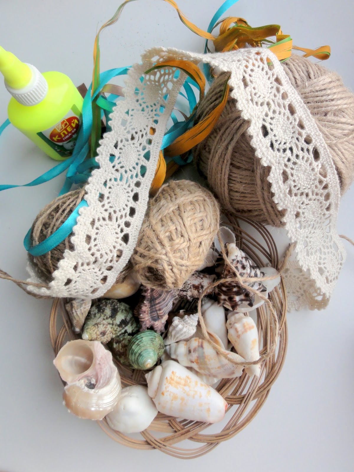 - всяка всячина для декора. У меня это были ракушки, речной жемчуг, элементы из перламутра. Также подойдут пуговицы, бусины, ленты, перья, шармики и иные красивости, что залежались у вас в запасах.