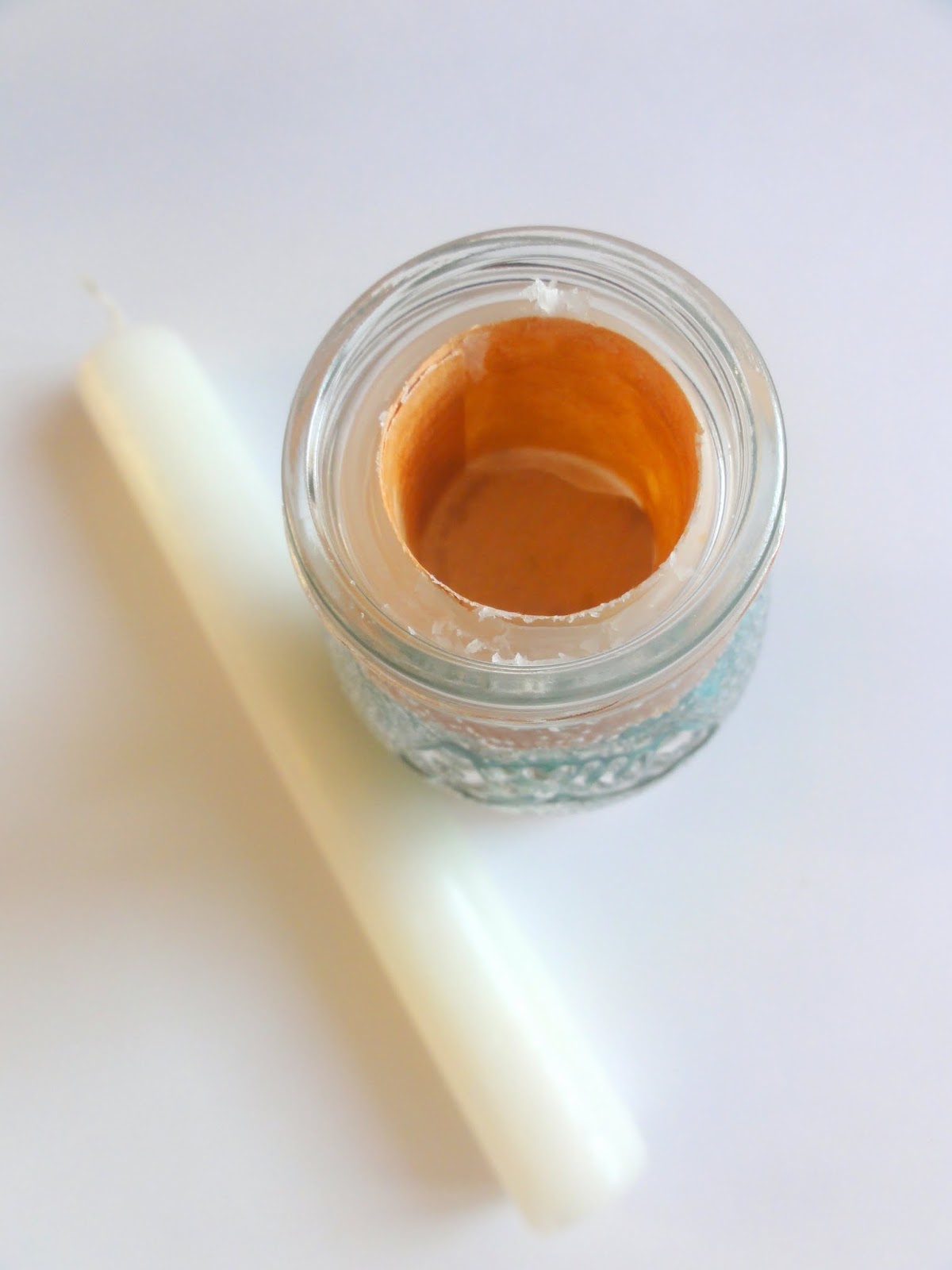 Теперь можно вынуть свечу из подсвечника и очистить поверхность бутылочки от потеков парафина.