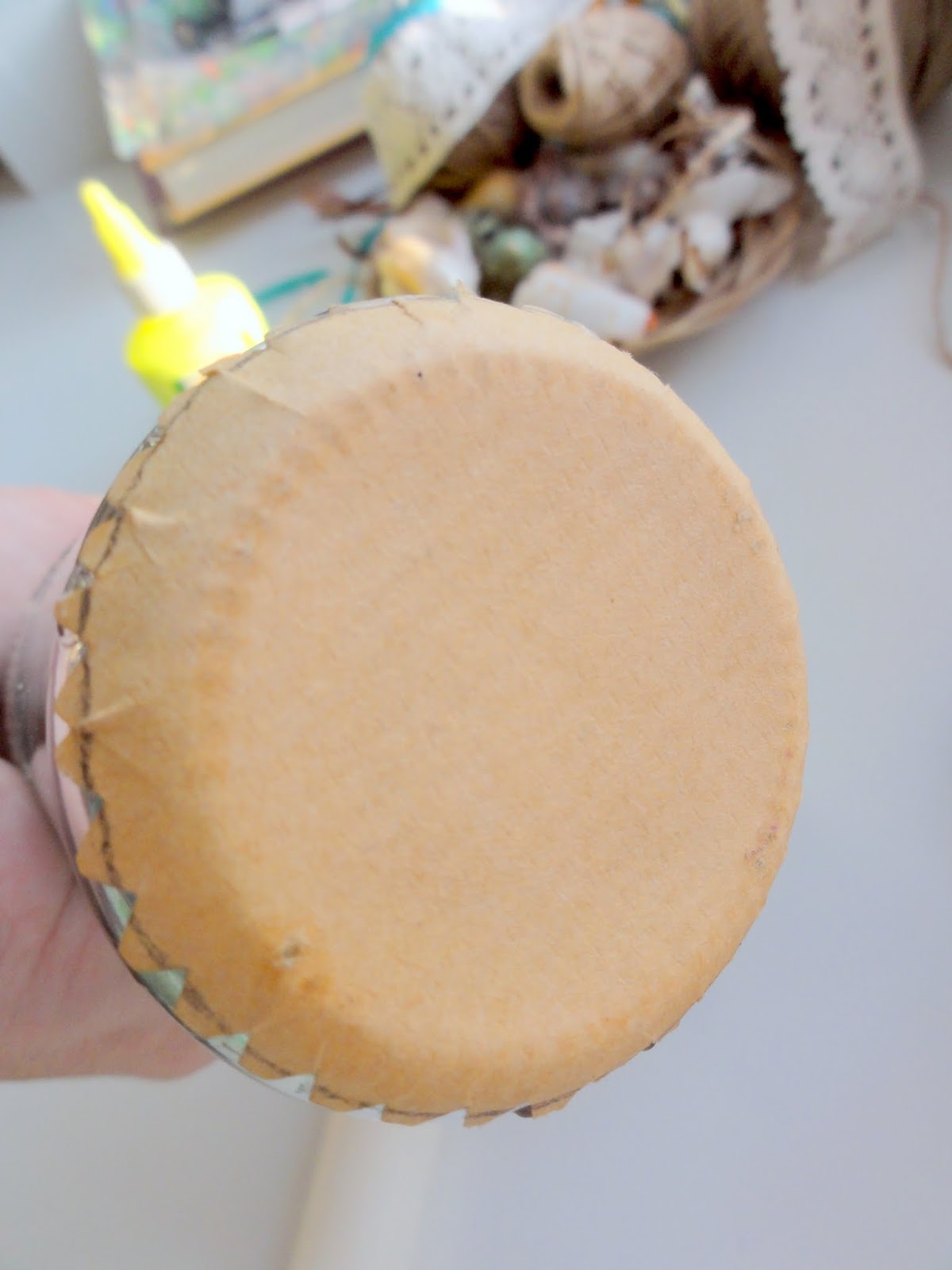 Декорируем верхнюю треть подсвечника кружевом и бечевкой - все приклеиваем на ПВА.