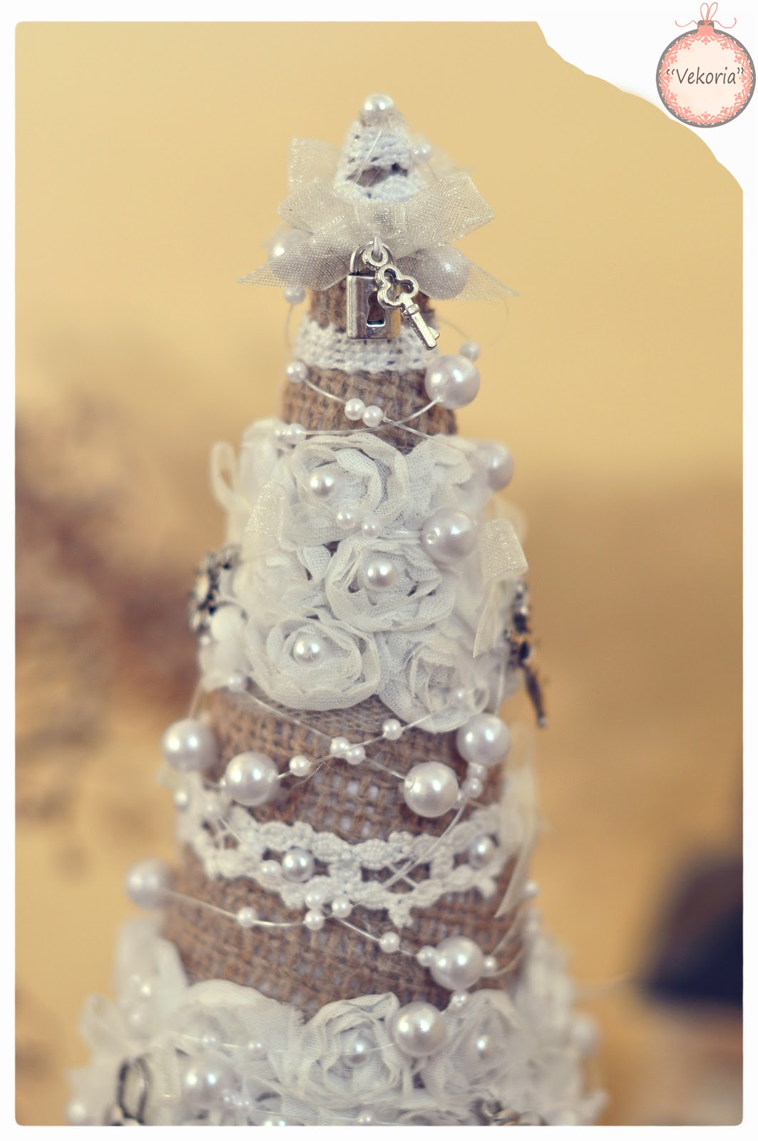 Основа ёлки ватман,на него наклеила мешковину,кружева (белые розочки - это кружево,купила в магазине),бусины и разнообразные фигурки,которые применяют,когда делают бижутерию.