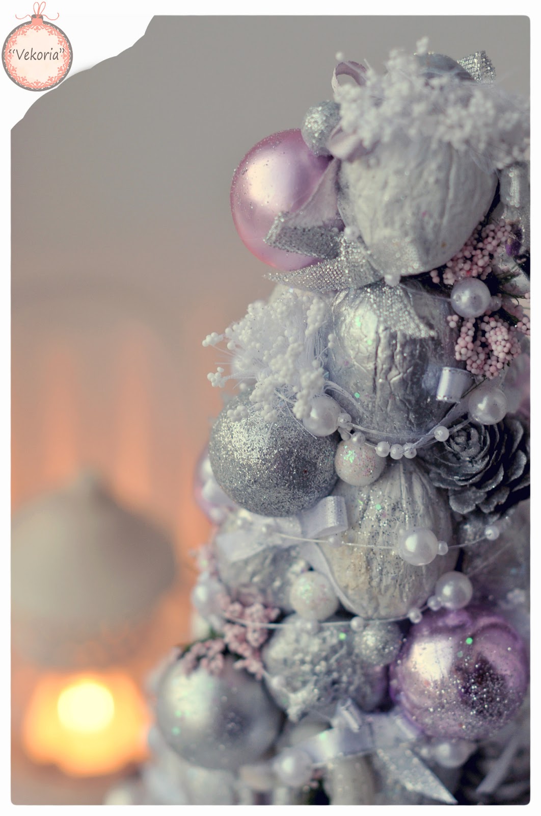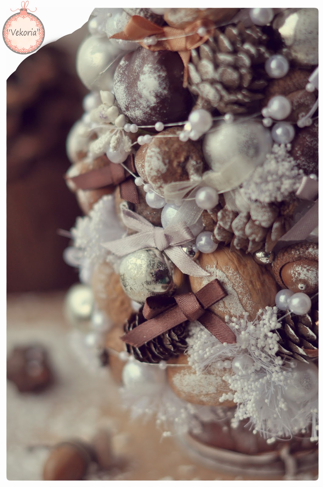 Ёлка получилась в холодных тонах.Тут я применяла мои любимые орехи,а точнее скорлупу от орехов.Красила их спреем.А так же применяла набор ёлочных игрушек.