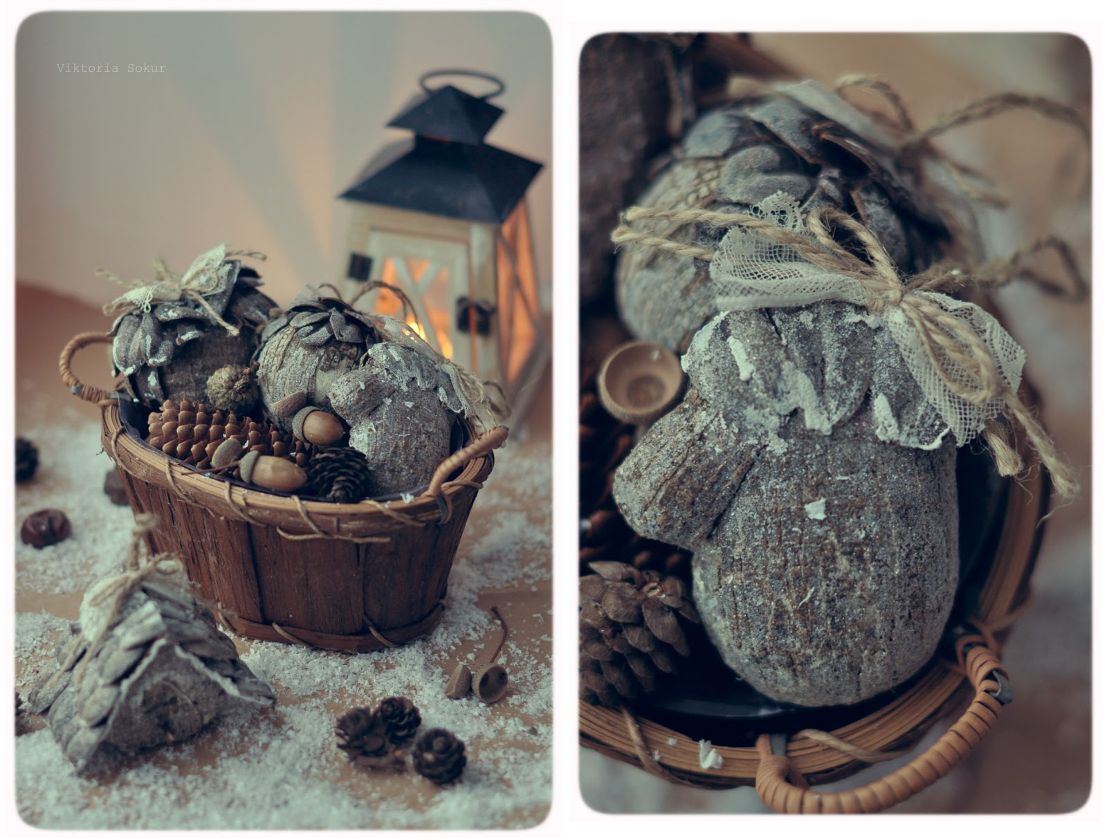 Представим,что пошёл первый снег и всё перемешалось : мои любимые орехи то покрылись снегом,то совсем чуть-чуть,то остались без снежинки,сочные красные яблочки и пучки с пенопластом,что имитируют снег и получился новогодний дуэт!