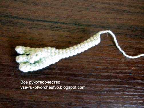 Для одной ступни сделать 2 пальца, сделать сс, нить обрезать и затянуть. На 3 пальце нить не обрезать, вязать сразу дальше.