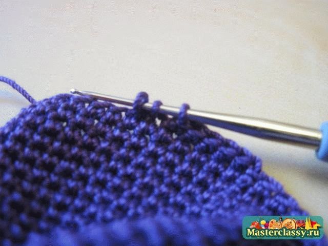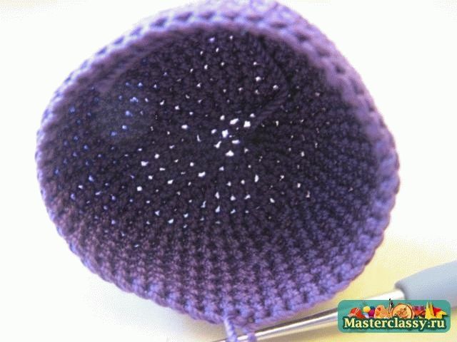 по 2 столбика без накида. Во втором ряду провязываем таким же образом. Получается небольшая шляпка.