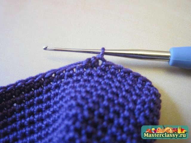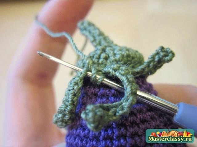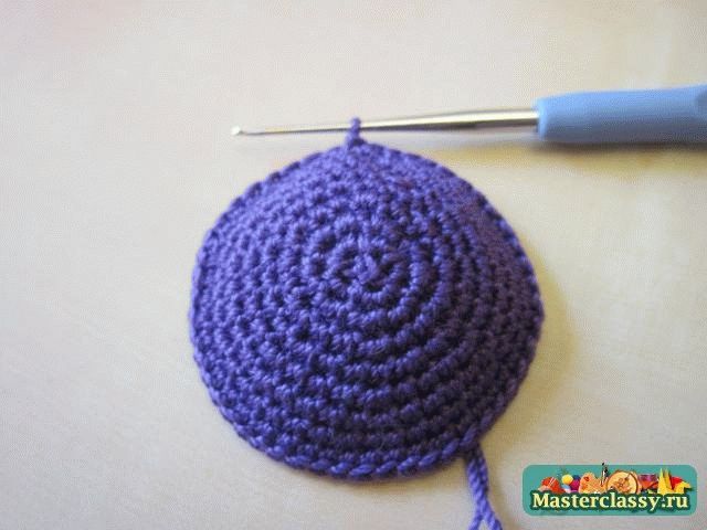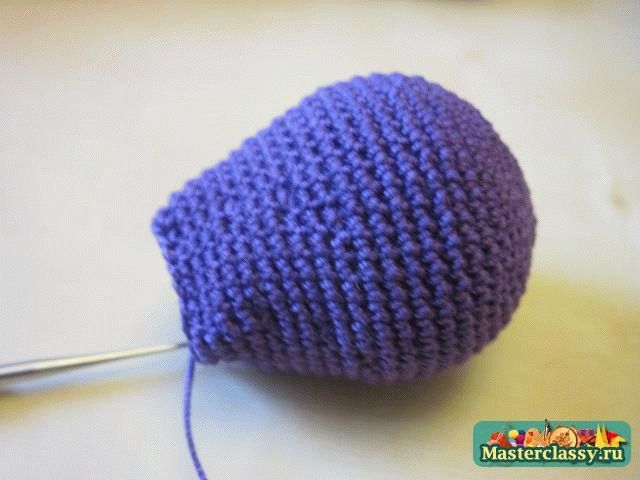 Накладываем эту шляпку на тело баклажанчика и соединительными столбиками провязываем к зауженной части баклажанчика.