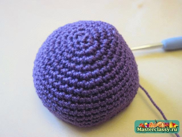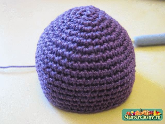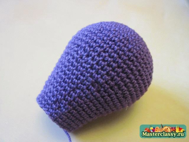 без накида между уменьшающими петлями. Постепенно добавляем синтепух таким образом, чтобы он не мешал самому процессу вязания.