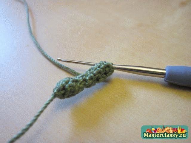 Затем вяжем основу для будущих листиков. Вяжем цепочки из воздушных петель разной длины, возвращаясь при этом каждый раз столбиками без накида.