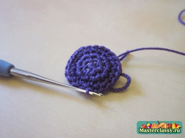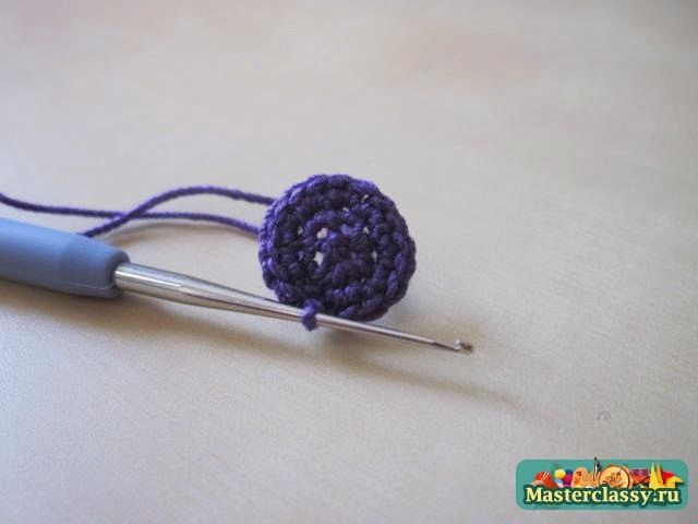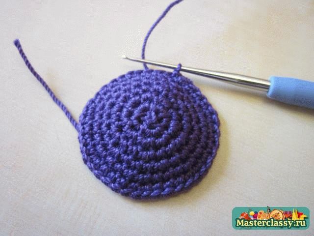 Первым делом необходимо связать тело баклажана. Для этого вяжем 4 воздушные петли и замыкаем их в круг.Далее провязываем первый ряд из столбиков без накида – по два столбика без накида в каждую петлю цепочки.