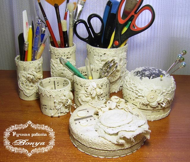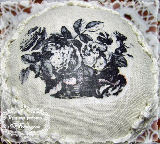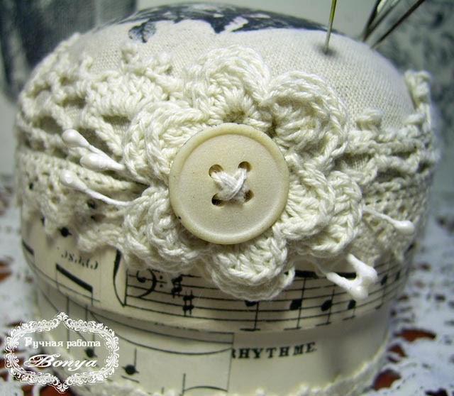 Игольницу сделала из бобинки от скотча, обклеила старинными нотами. На лен перевела рисунок, обшила самовязанным кружевом, добавила цветок с пуговкой.