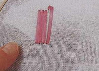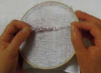 2. Воткните иголку в ткань, регулируя левой рукой натяжение ленты, чтобы во время протаскивания иголки через ткань не образовались другие узелки, которые будет трудно распутать. Потом вновь воткните иголку в ткань с изнанки.