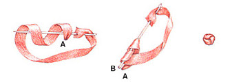 Шов «закрученная лента» представляет собой ленту скрученную в виде спирали. Лента, прикрепленная несколькими ниточными потайными стежками к основной ткани, выводится на лицевую поверхность фонового материала и закручивается последовательно и продольно подобно спирали. Необходимо следить за правильностью расположения ленты: она должна выкладываться блестящей лицевой стороной наверх и не заходить на ближайшие витки ленты, кромки должны касаться друг друга встык. В щели касания ленточных кромок прокладываются потайные ниточные стежки, соответствующие цвету ленты, которые прикрепляют ленту к ткани. Чтобы витки закрученной ленты не раскручивались, ленточный конец выводится на изнаночную сторону и прикрепляется к основному материалу потайными ниточными стежками. Закрученная лента применяется для изображения стеблей, ветвей, узких лепестков цветов. Цветочные тычинки можно выполнить ленточным жгутом с узлом на конце.