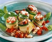 Посолите ломтик цуккини, положите на край шарик моццареллы, заверните его в кабачок, сверху в получившийся стаканчик положите ещё один шарик (или полшарика) моццареллы, завяжите рулетик пёрышком зелёного лука или аккуратно скрепите зубочисткой.