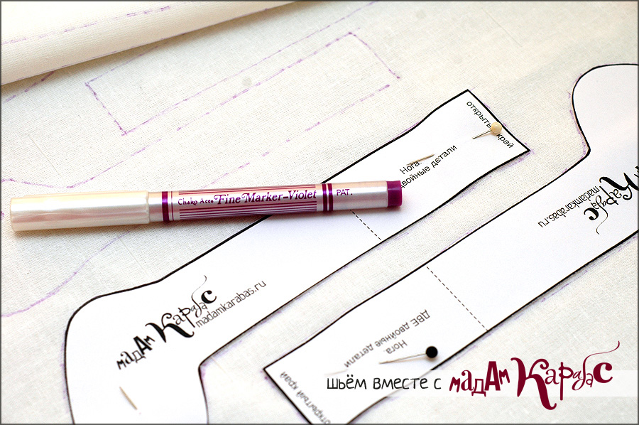 Переносим выкройку на ткань. Я это делаю швейным фломастером, след от которого исчезает сам (без стирки!) через 24-48 часов. Припуски на швы – примерно 3-4 миллиметра.