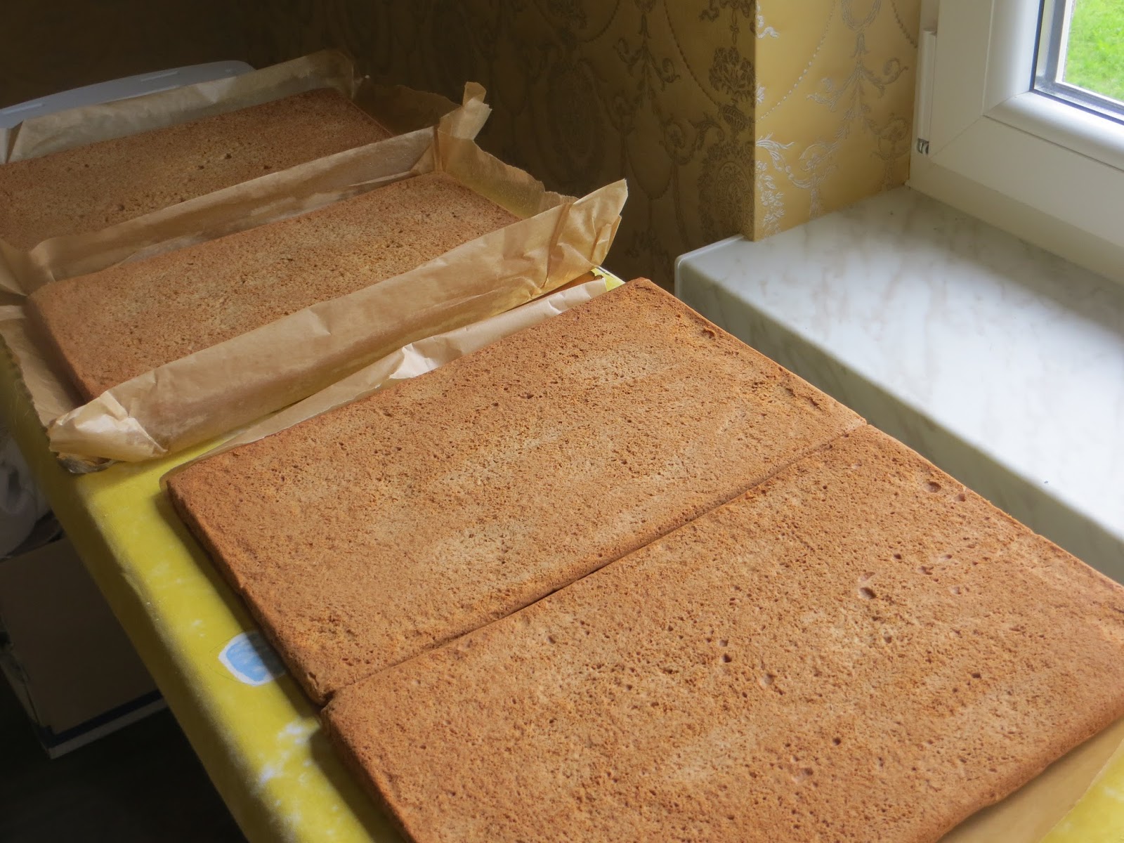 Маргарин порубить с мукой, смешанной с содой и сахаром. Добавьте мед и яйца. Замесить тесто. Мы делим на 4 равные части. .Вылить в протвинь каждую часть Выпекать в течение 30 мин. При температуре 180 градусов.