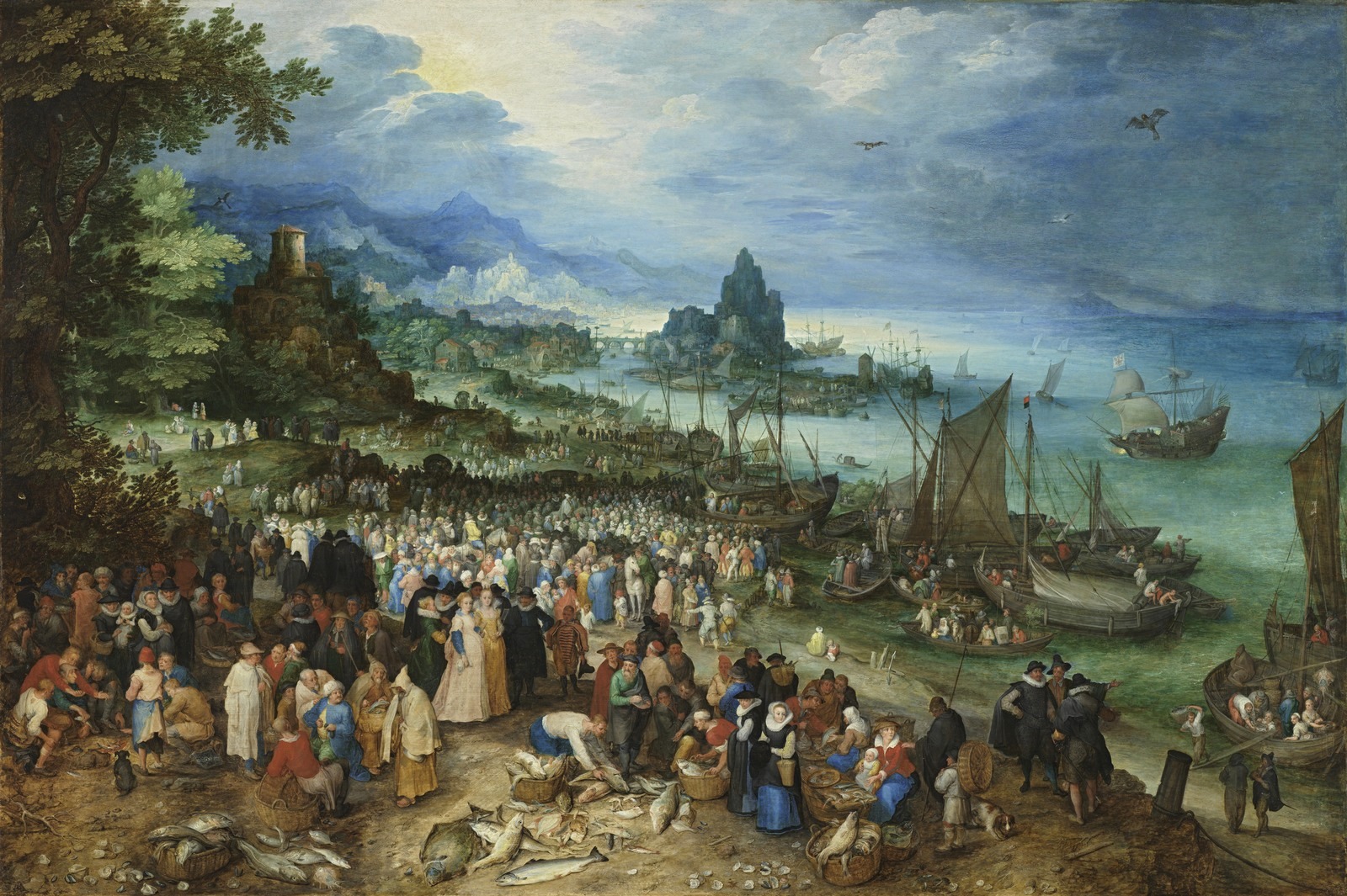 Портовая сцена с проповедью Христа (Harbour Scene with Christ Preachin)_1598_79.3 x 118.6_д.,м._Мюнхен, Старая пинакотека
