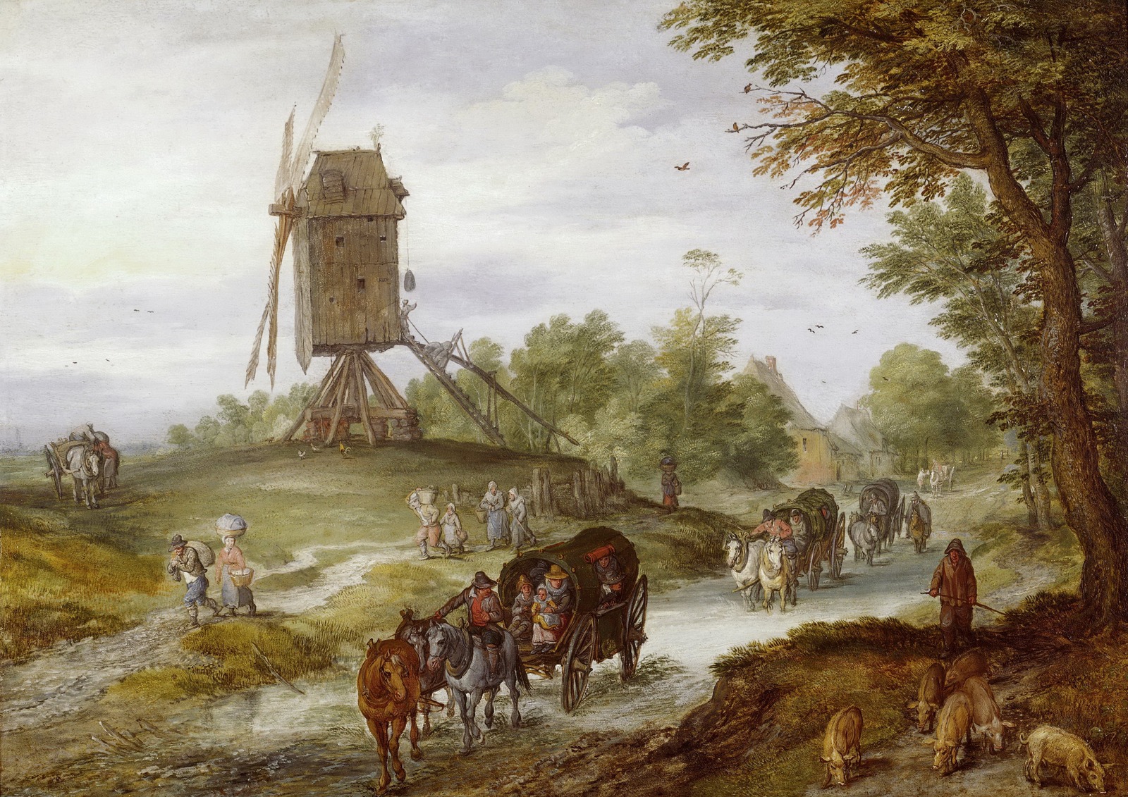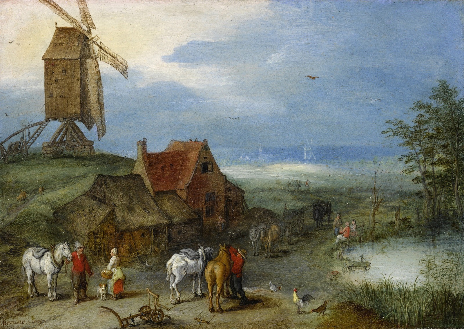 Пейзаж с мельницей и фигурами у дома (Landscape With A Windmill, Various Figures, Horses, And Animals Near A Farmstead)_1606_11.7 х 16.5_медь, масло_Частное собрание