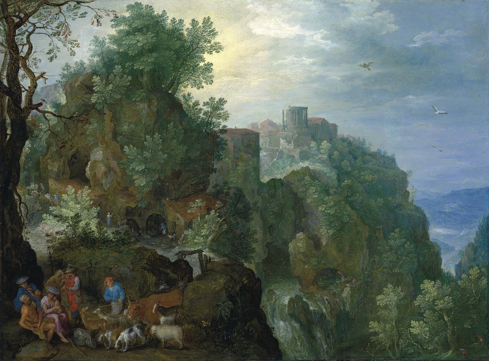 Горный пейзаж с пастухами, отдыхающими у тропинки, с видом на Тиволи (A mountainous landscape with herdsmen resting by a path, a view of Tivoli)_18.7 х 25.4_м.,м._Частное собрание