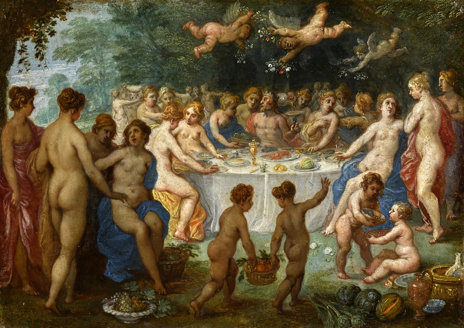 Пир богов, возможно свадьба Пелея и Фетиды (The Feast Of The Gods, Possibly The Wedding Of Peleus And Thetis) (совместно с Хендриком ван Баленом Ст)_11 х 15.3_медь, масло_Частное собрание