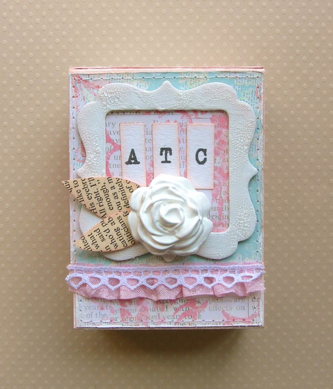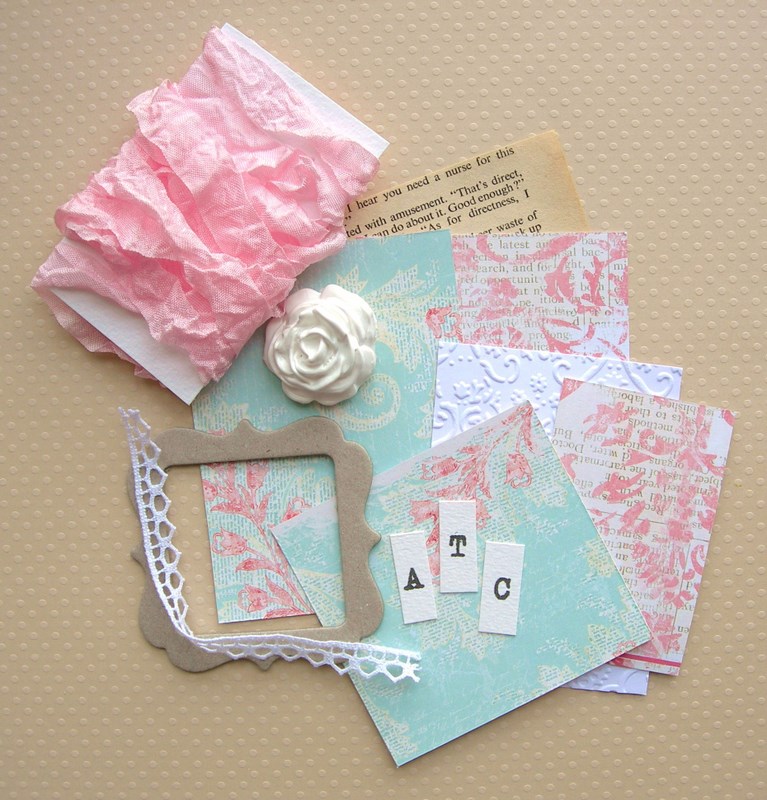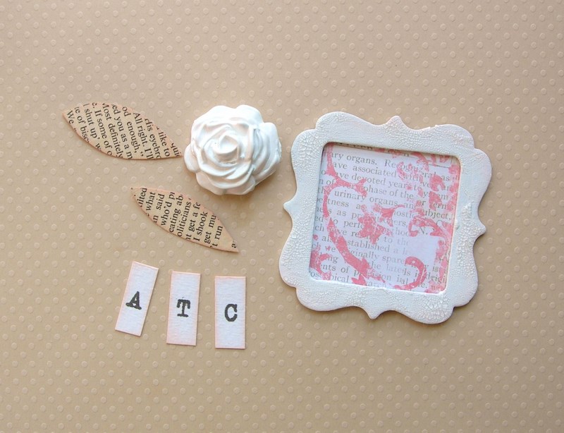 Шаг 5. Для декорирования крышки папки понадобятся: рамочка из чипборда, отрезки скрап бумаги, страница из книги, отрезок ленты и кружева, надпись, «гипсовое» украшение, магнитная застёжка.