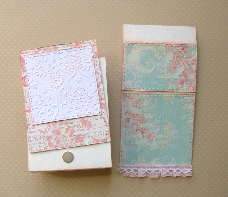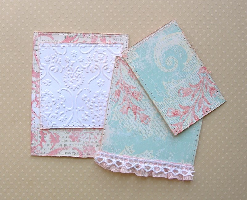 Отрезки скрап бумаги надо прошить по периметру. Также пришейте ленту и кружево. Края надо немного состарить и