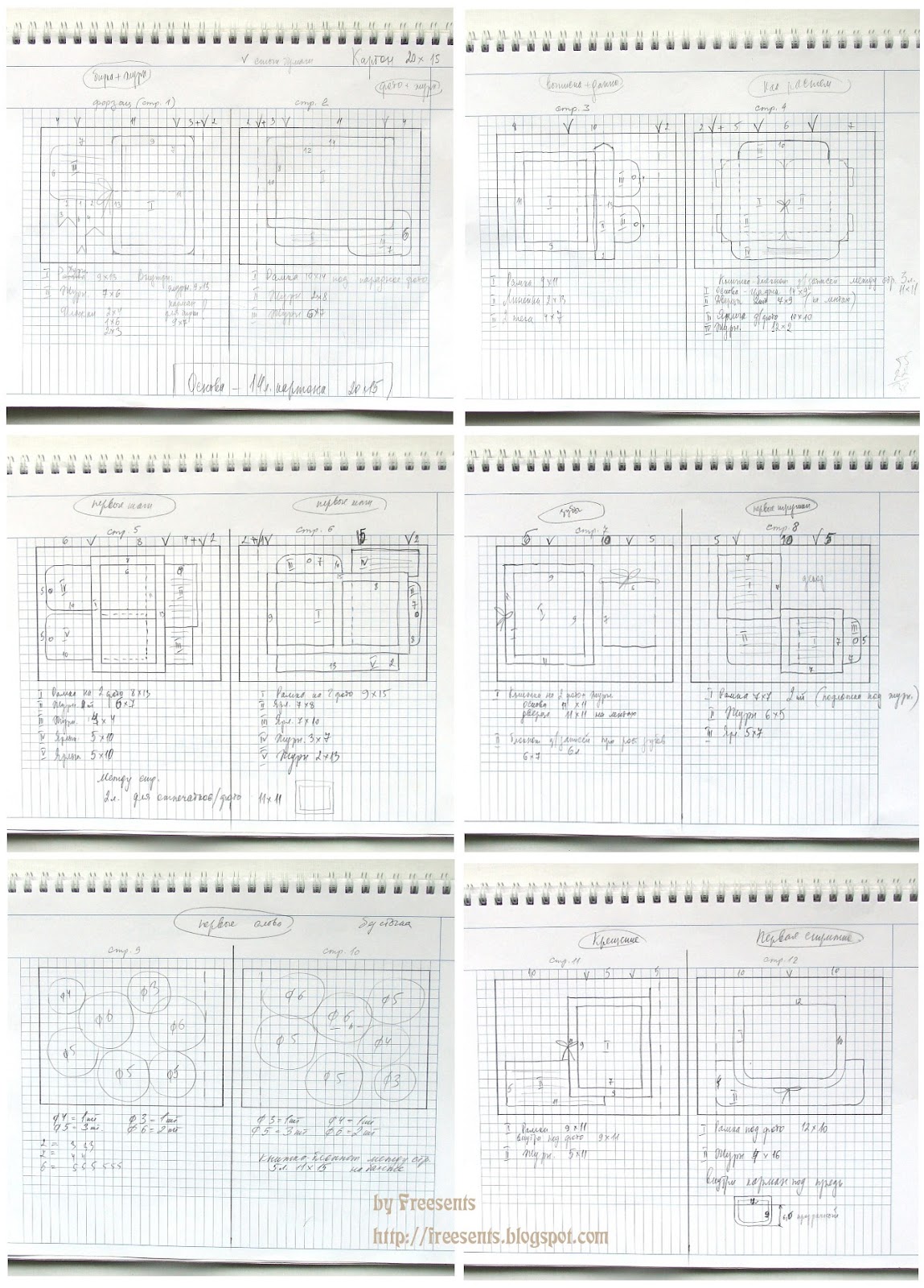 Шаг 1. На бумаге в клеточку чертим эскизы каждой страницы в масштабе ( у меня обычно 1 клетка – 1 см). Если не хватает альбома, беру листы миллиметровой бумаги. Эскизы должны быть очень подробные, со всеми элементами, также надо проставить все размеры деталей. Так как страница будет составлена из нескольких видов бумаги, галочками я отмечаю на фоне места стыка. Сразу решаю, где будет декор.