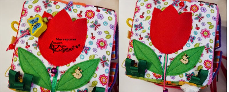 4. Цветочек. В цветочек залетает бабочка (если дергаем ша шнурочек). За травкой прячется божья коровка и паучок.