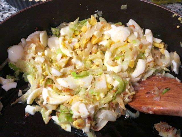 Яйца варим вкрутую, остужаем, очищаем и мелко нарезаем. Смешиваем капусту и яйца. Пробуем и подсаливаем, если нужно.