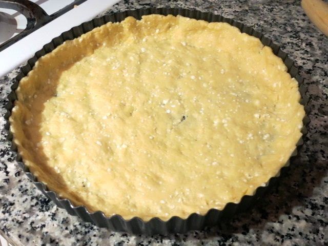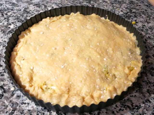 Форму для тартов смазываем растительным маслом. Руками распределяем большую часть теста по дну и стенкам формы.