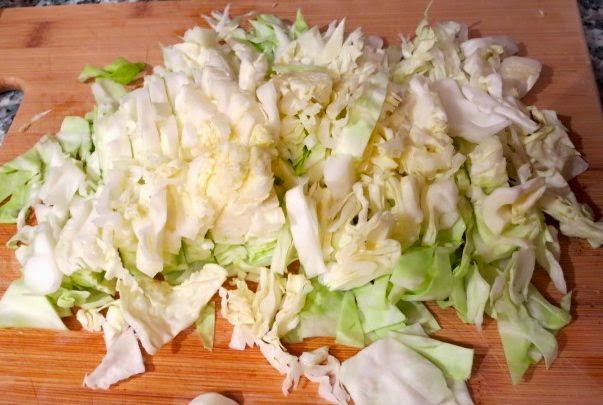 Готовим начинку. Капусту тонко шинкуем, лук нарезаем тонкими полукольцами.