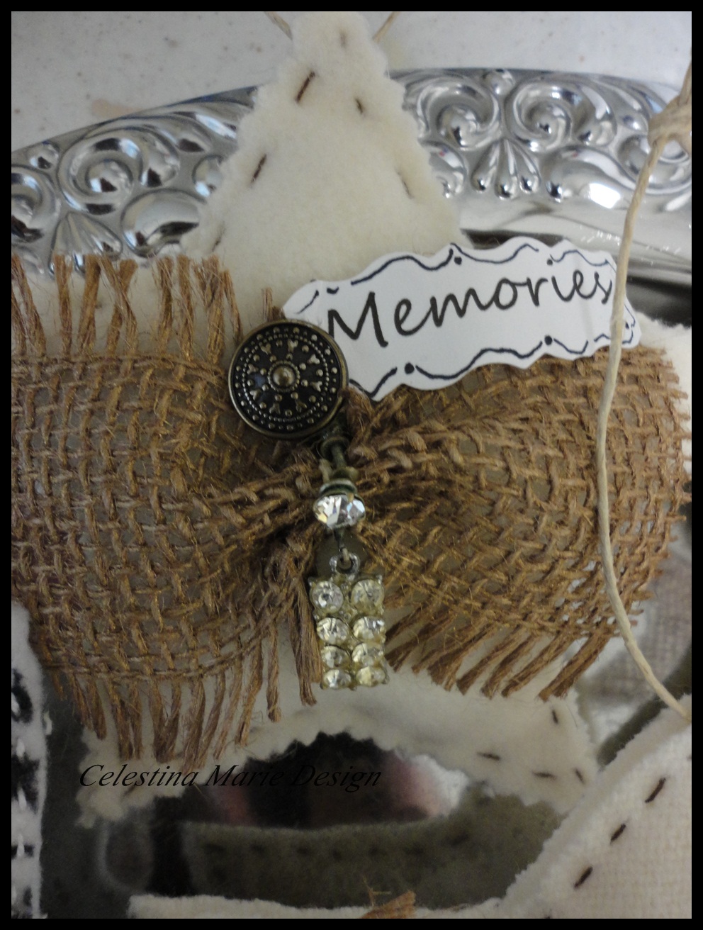 Теперь мы готовы добавить украшения или джута для дисплея вешалки. Вы можете видеть, я также добавила немного мешковины ленты к центру и сшитые на месте.
