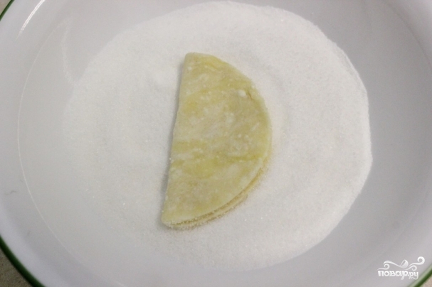 11. Согните кружок полумесяцем, затем снова опустите одной стороной в сахар.