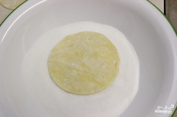 9. Приготовьте тарелку с сахаром. Одну сторону кружка из теста обмакните в сахар.