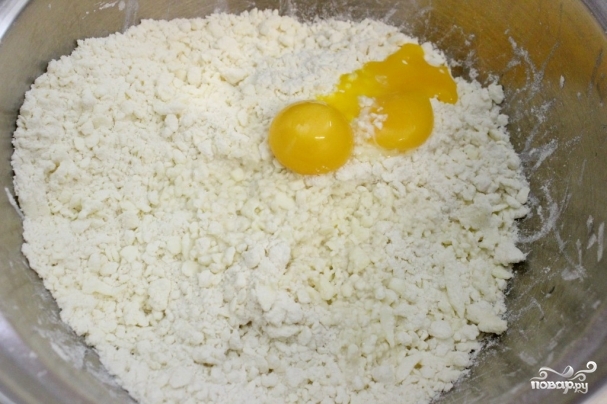 5. Добавьте в тесто яичные желтки и воду (желательно - кипяченую).