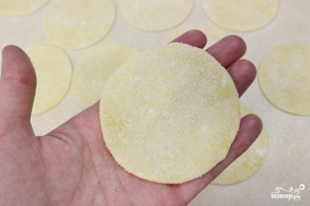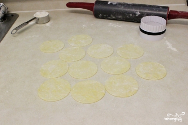 8. Через час включите духовку разогреваться на 190 градусов. Противень застелите пергаментной бумагой. Стол присыпьте мукой и довольно тонко раскатайте часть теста. Формочкой или блюдцем (диаметром - 7-8 см) сделайте кружочки.
