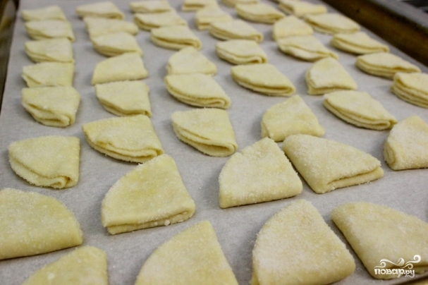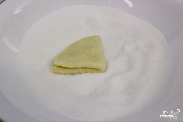 12. Заверните еще надвое, сахарной часть внутрь. Одну из четвертной части обмакните в сахар.
