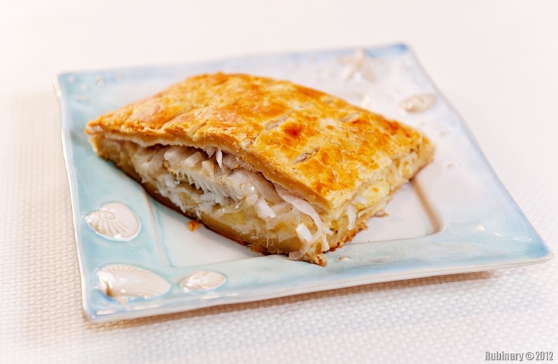 Берем глубокий противень раза в два меньше по площади, чем для пирога с грибами и картофелем. Выстилаем противень бумагой для выпекания. Тесто делим пополам. Выкладываем одну половину теста на противень и разравниваем руками. Чтобы тесто не прилипало к рукам, руки можно смазать растительным маслом. На тесто выкладываем куски рыбы, перед этим посоленные и поперченные по вкусу. Сверху на куски рыбы надо выложить слой покрошенного лука и немного сбрызнуть растительным маслом. Накрыть второй половиной теста. Слои теста по краям защепить.