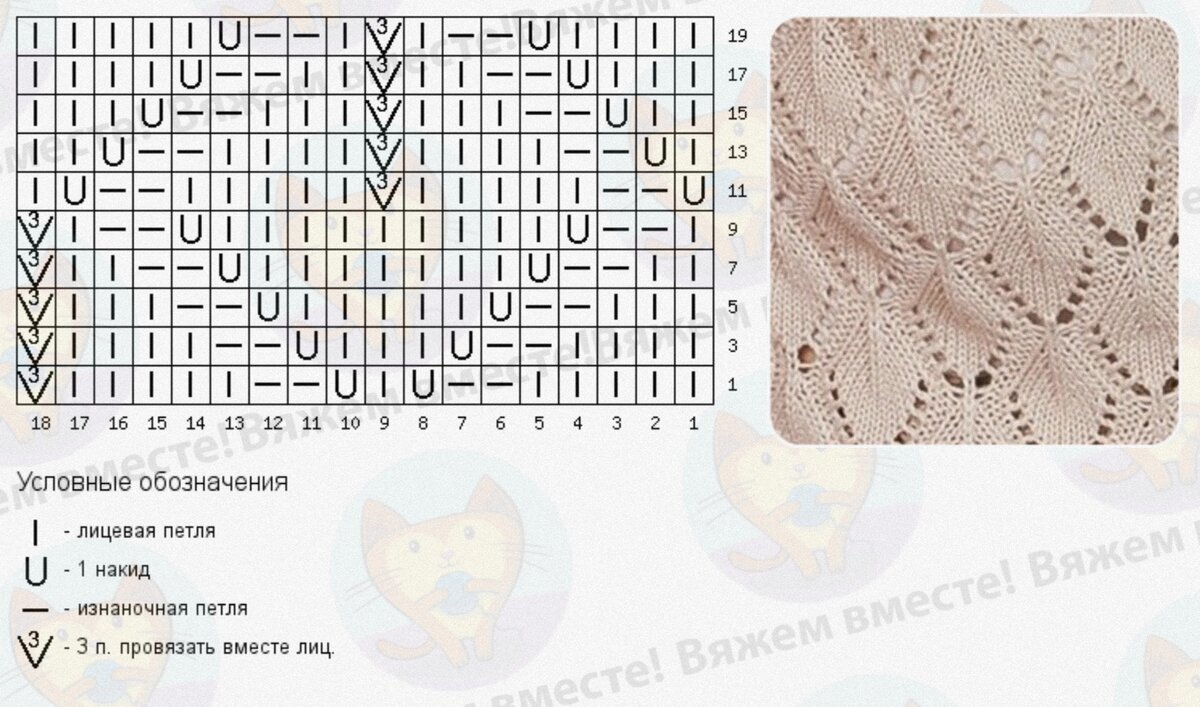 Схема узора составлена для одного раппорта, который состоит из 18 петель и 20 рядов. На схеме обозначены только нечетные ряды, четные вяжутся так, как лежат петли на спице. Двойные убавления при вязании данного узора следует вязать так, чтобы центральная петля лежала поверх двух соседних.