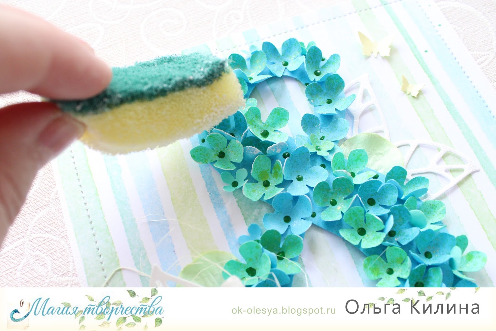 12. Приклеиваю бабочек, поздравительную надпись (сделанную в технике "горячий эмбоссинг" на кальке) и объемные цветы, подходящие по цвету скорее под фоновую бумагу, чем под восьмерку).