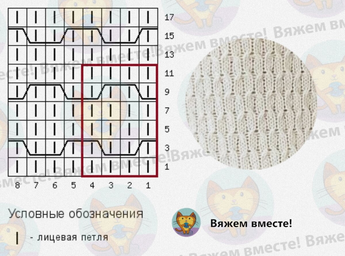 На схеме узора петли раппорта обозначила красной рамкой — это 4 петли в ширину полотна и 12 рядов в высоту.
