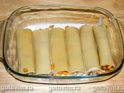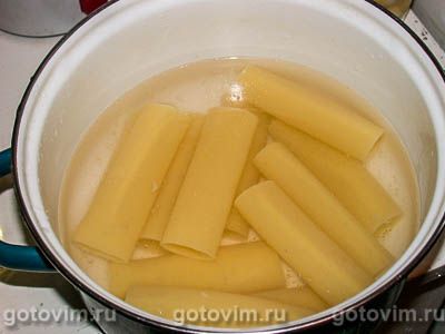 Каннелони отварить до полуготовности (или используйте сухие трубочки, уточните, что написано на упаковке с каннелони). Полуготовые каннелони промыть в холодной воде. Начинить каннелони фаршем. |