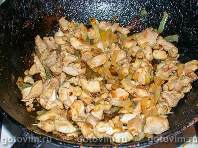 Для начинки курицу мелко порезать. Лук нарезать кубиками и потушить вместе с курицей в 1 стол. ложке растительного масла. |