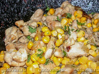 Добавить к мясу кукурузу и мелко нарезанную зелень, тушить в течение 10 минут под крышкой. |