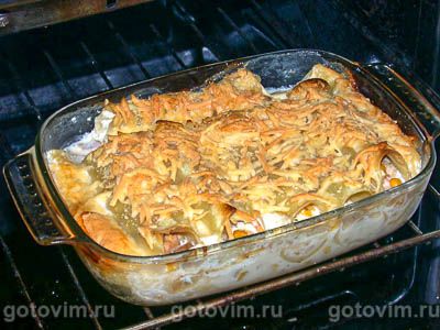 Полить каннелони соусом и запечь при 200 С до появления корочки (около 20 минут). Готовые каннелони разложите по тарелкам и по желанию посыпьте тертым сыром. |