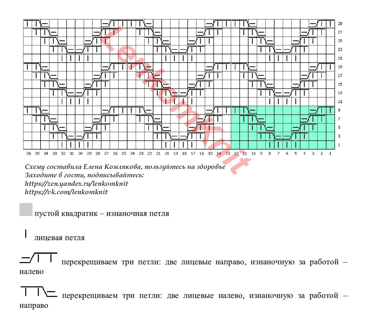 Схема узора очень простая (составлена для лицевых рядов). Раппорт узора - 12 петель в ширину и 10 рядов в высоту (выделен зеленым цветом).