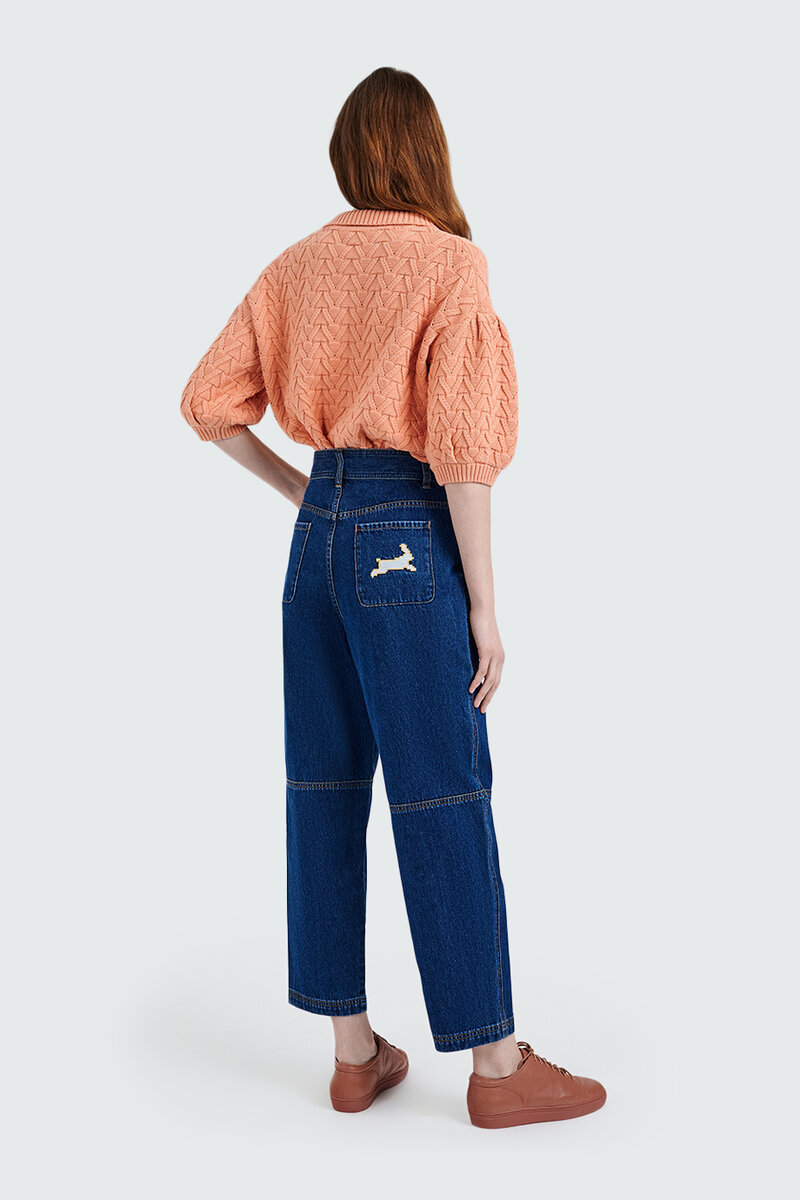 Свитер с пышным рукавом-фонариком и воротничком-поло теплого и насыщенного персикового цвета. В принципе, в модели все достаточно простое - покрой, узор. Но в комбинации получилась очень интересная и модная вещь.