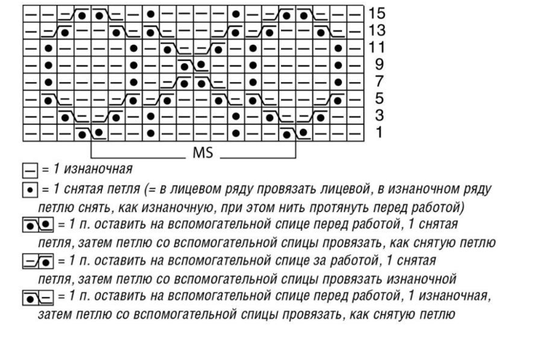 б) Узор из снятых петель. Число петель должно быть кратно 12 + 8 плюс 2 кром. Вязать согласно схеме, на которой указаны только лиц. ряды. Изнаночные ряды вязать по рисунку или так, как указано.